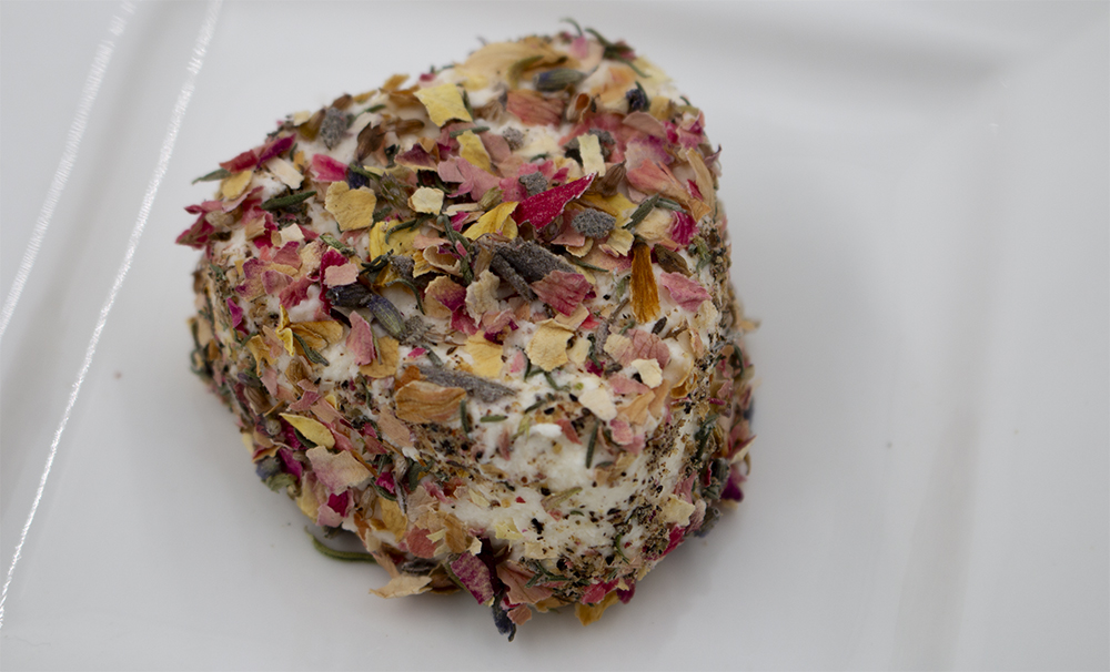 In kleinen Formen oder selbst gedrehte Kugeln und in Blüten oder Kräuter wälzen.